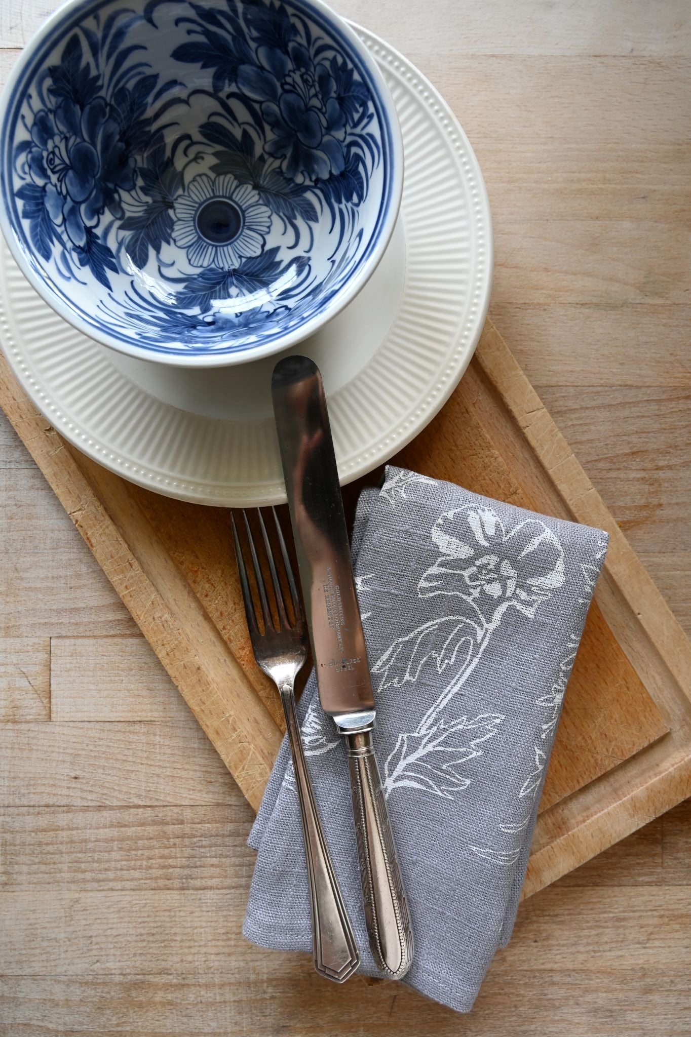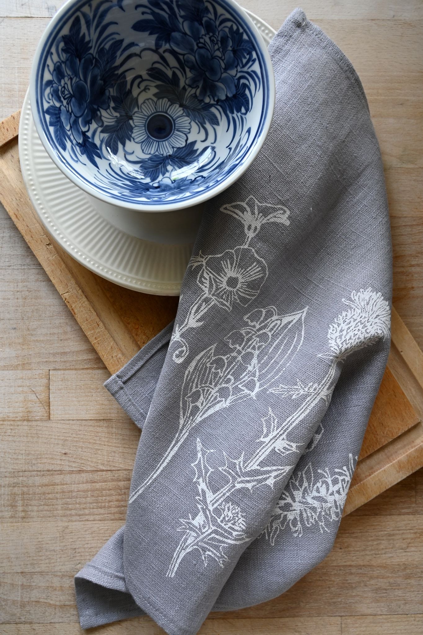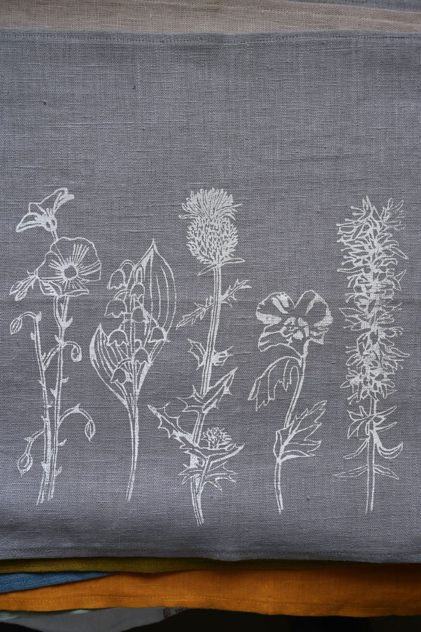 An artisan made printed napkin rich with smoky purple-grey linen that's ideal for your English cottage interior. Designed by local Bath artist Kate Westcott, with an illustration of meadow flowers screen printed in white on the hazy grey backdrop.