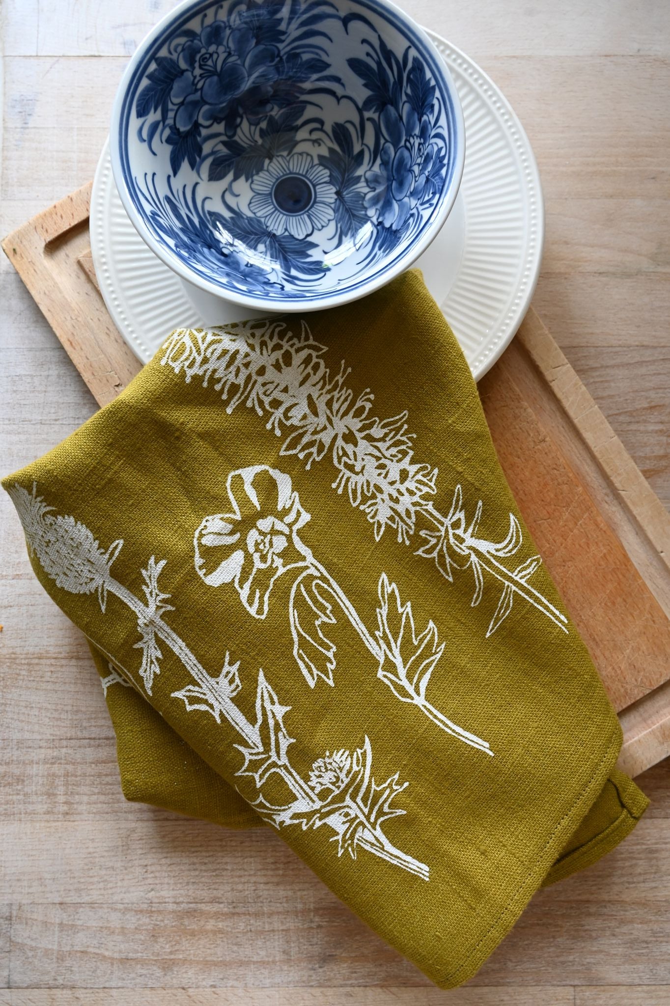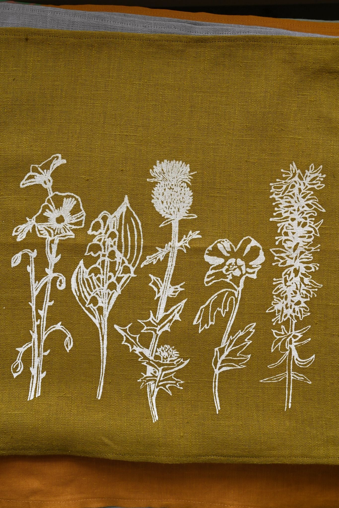 An artisan made printed napkin rich with ochre yellow linen that's ideal for your English cottage interior. Designed by local Bath artist Kate Westcott, with an illustration of meadow flowers screen printed in white on the textured yellow backdrop.