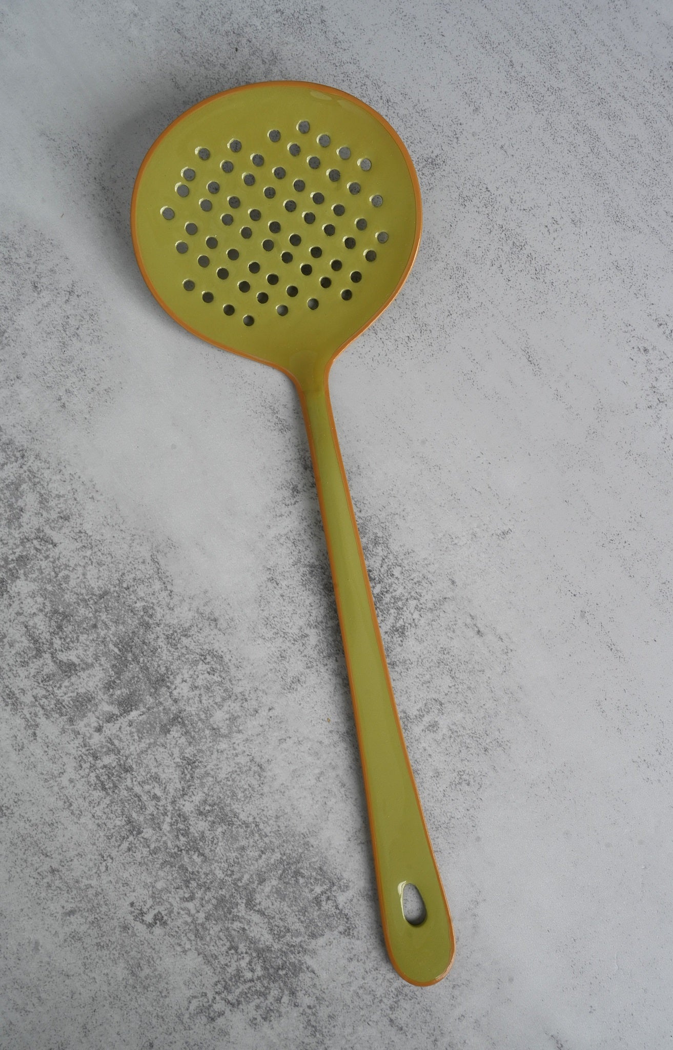 From our enamel kitchenware collection, this lime green skimmer utensil is made from stainless steel and is finished with a border to look just like vintage cookware.