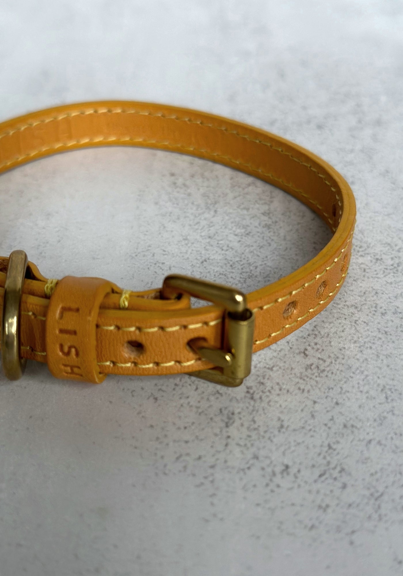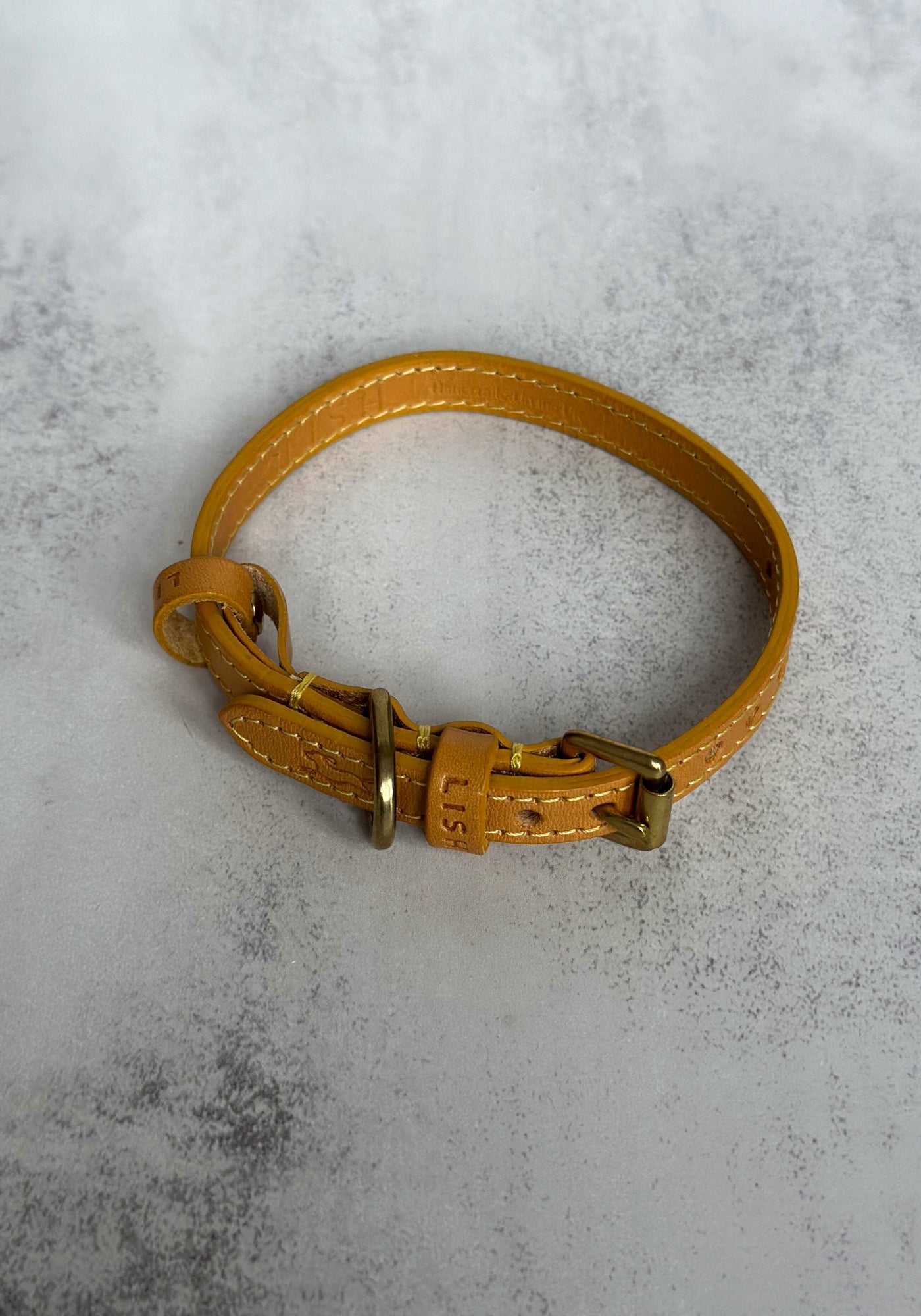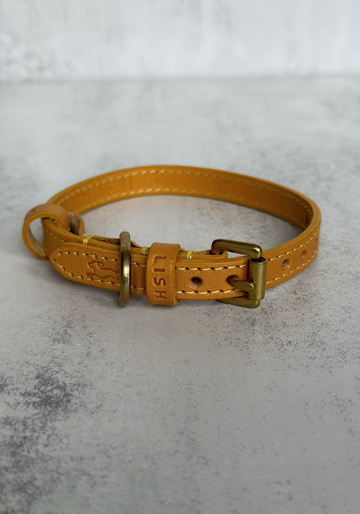 A beautifully handcrafted leather dog collar made from the highest quality leather, vegetable-dyed in the heart of Tuscany to achieve that English mustard colour that we love right now and then assembled in England. Each collar has been hand stitched and then finished with solid brass hardware, designed to last for years to come.