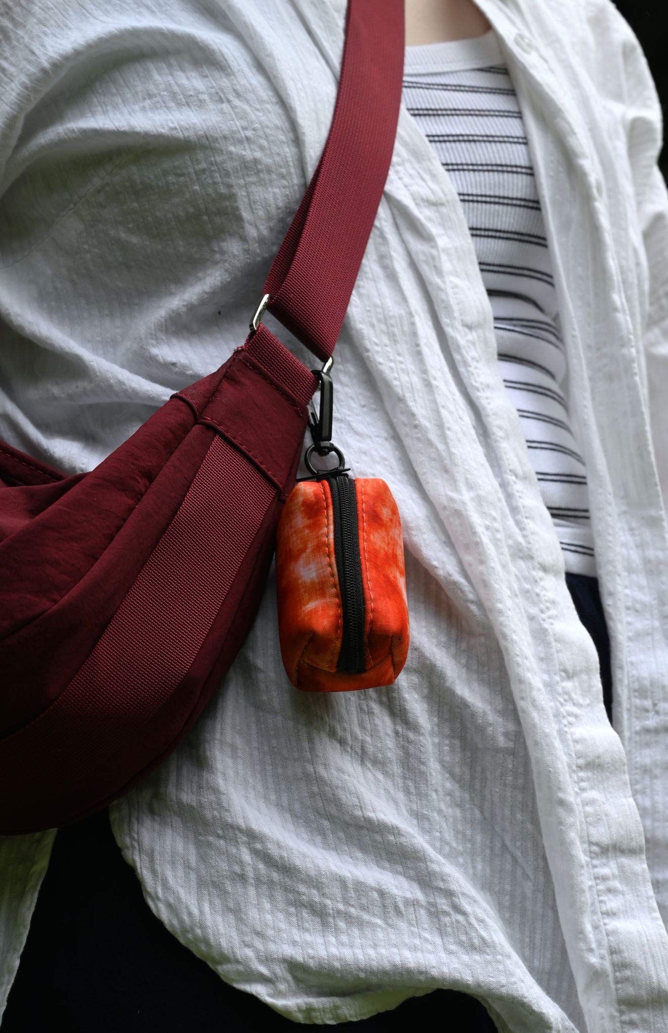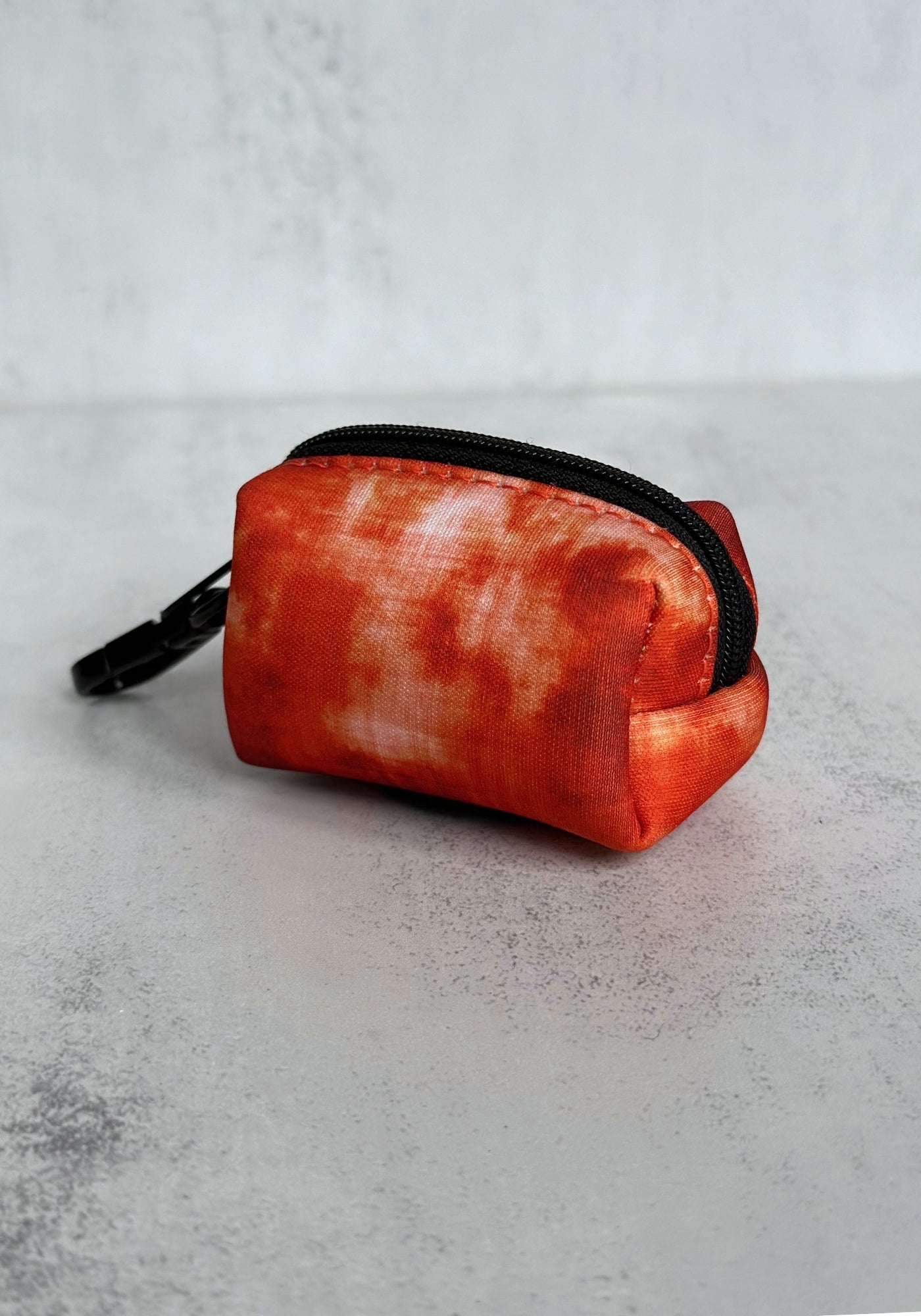 A trippy orange tie dye style poo bag holder handmade from a fast drying neoprene. This little padded bag is particularly designed for easy access to dog poop bags thanks to the rubber release hole on the underside which allows you to pull out a bag without having to unzip the case and the black clip means you can attach it to your belt or dog lead so you and your hound will never again be caught out!