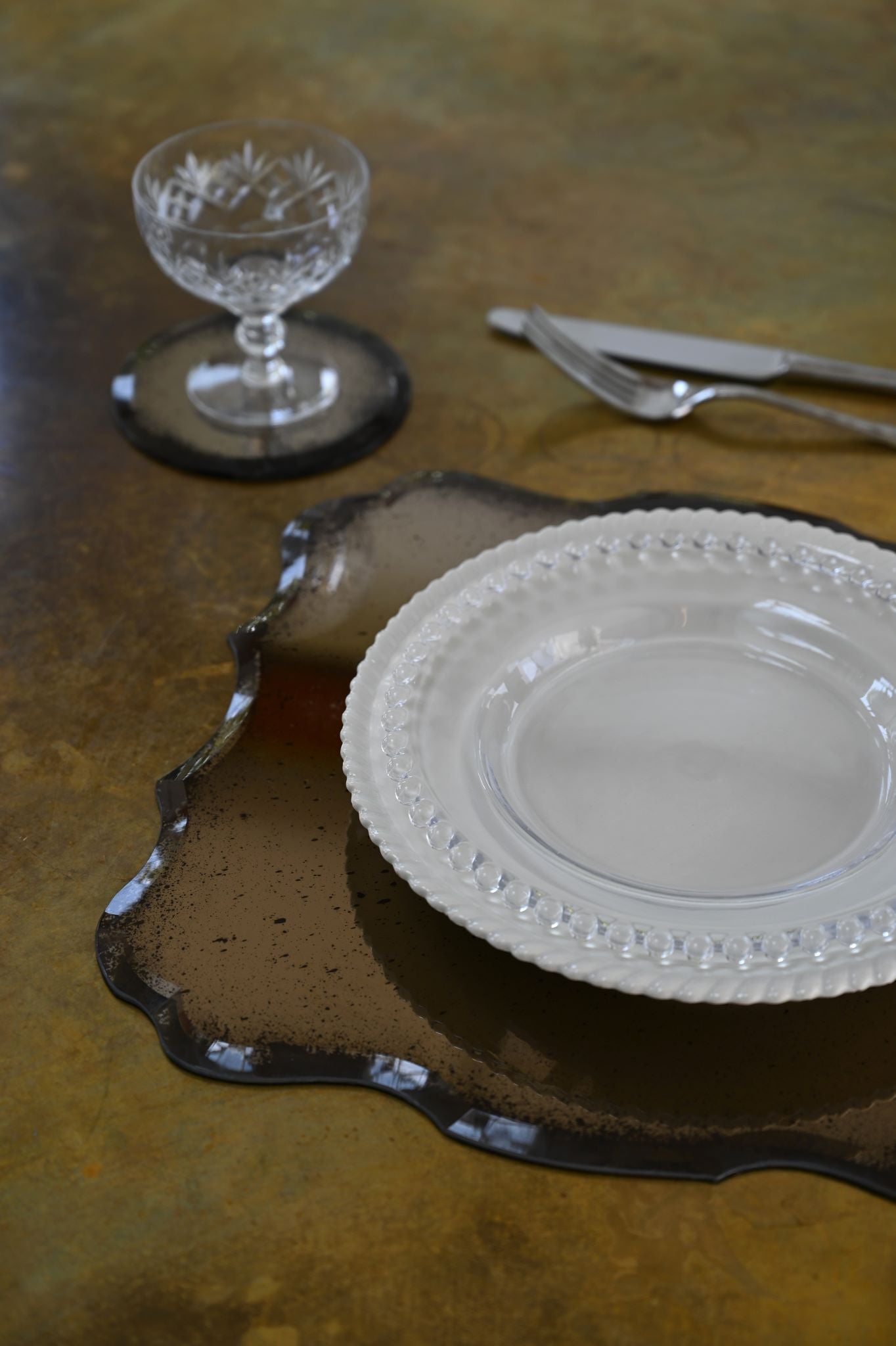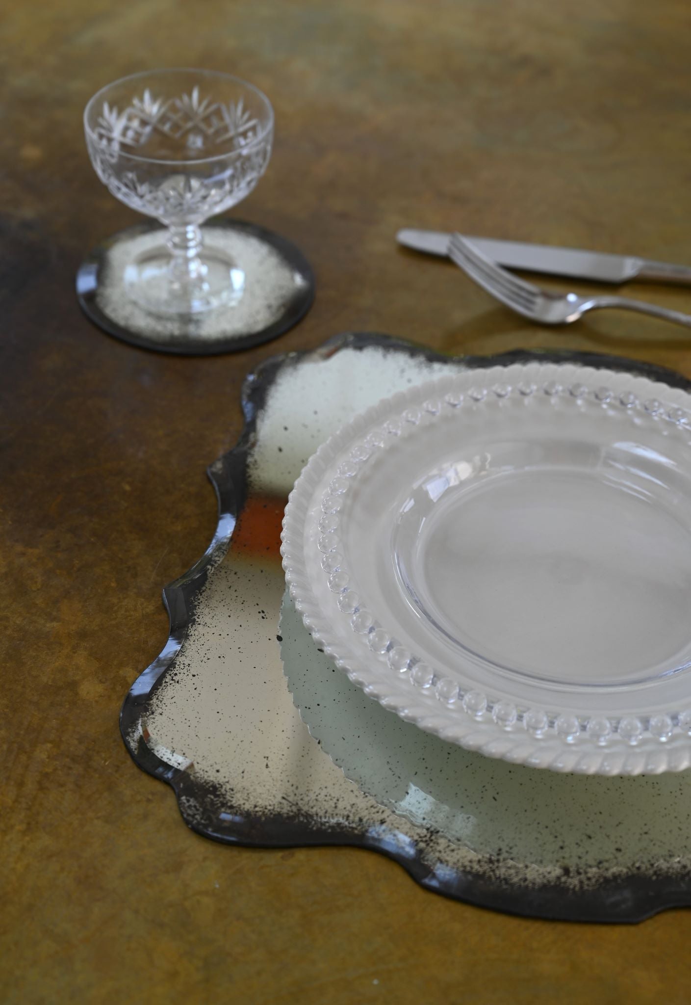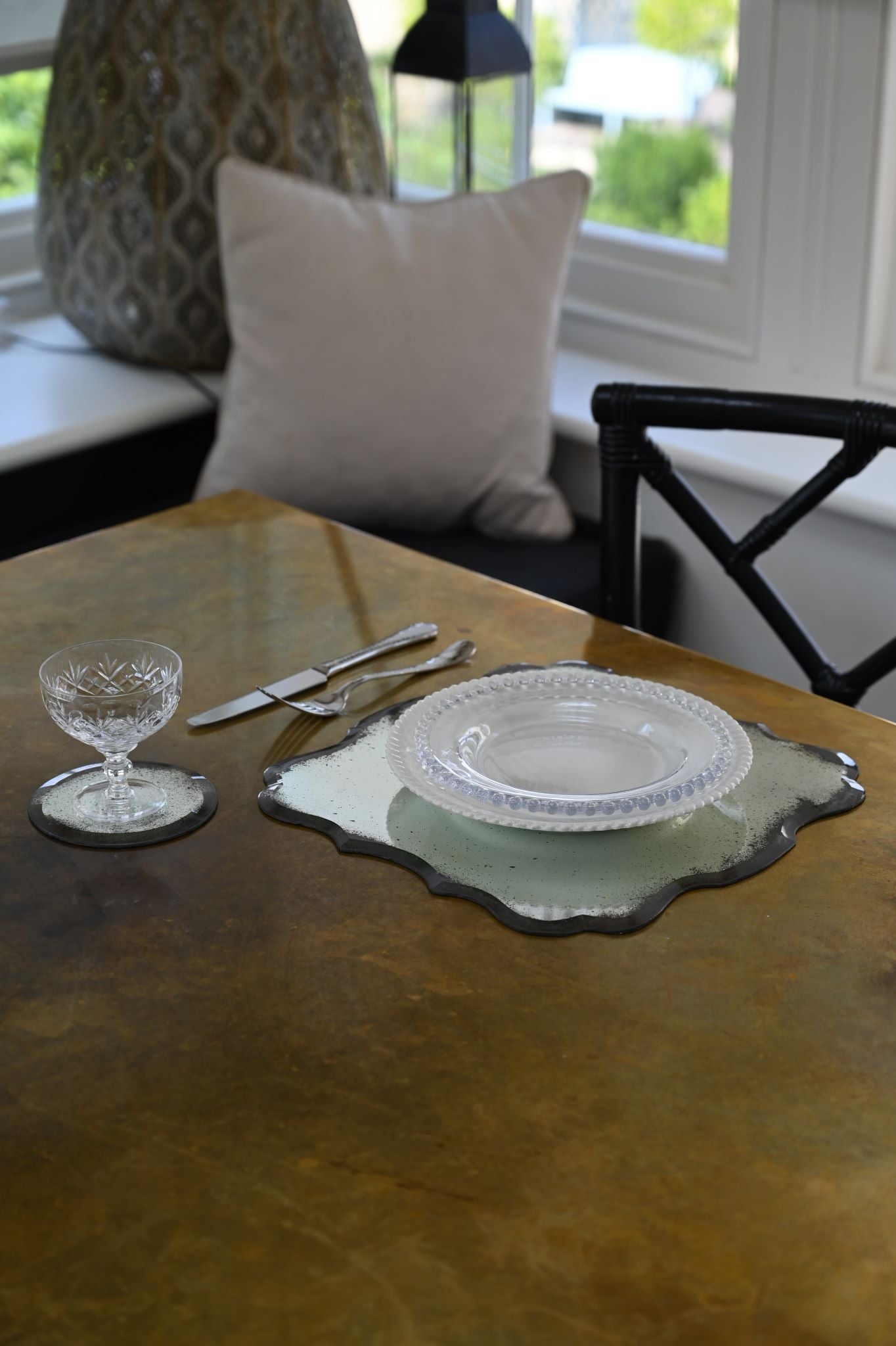 Reflect your home style with these ornate square placemats made of mirror with a hand bevelled scalloped edge. Each placemat has been gilded by hand by local maker Sean Phelan with a lustrous coloured finish and a distressed look border. If you've got handmade table you particularly love and want to show off, these mirrors are the perfect backdrop.
