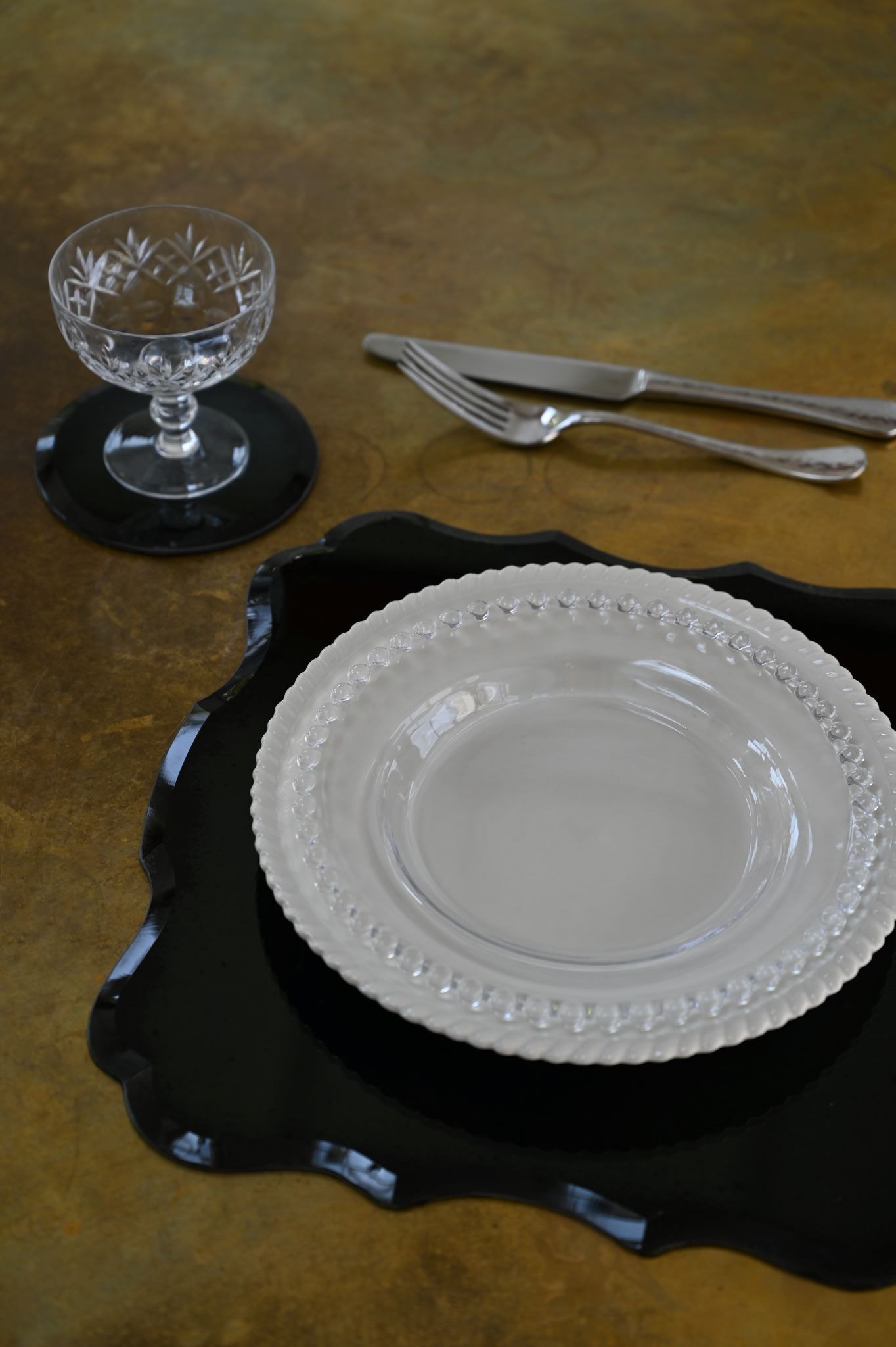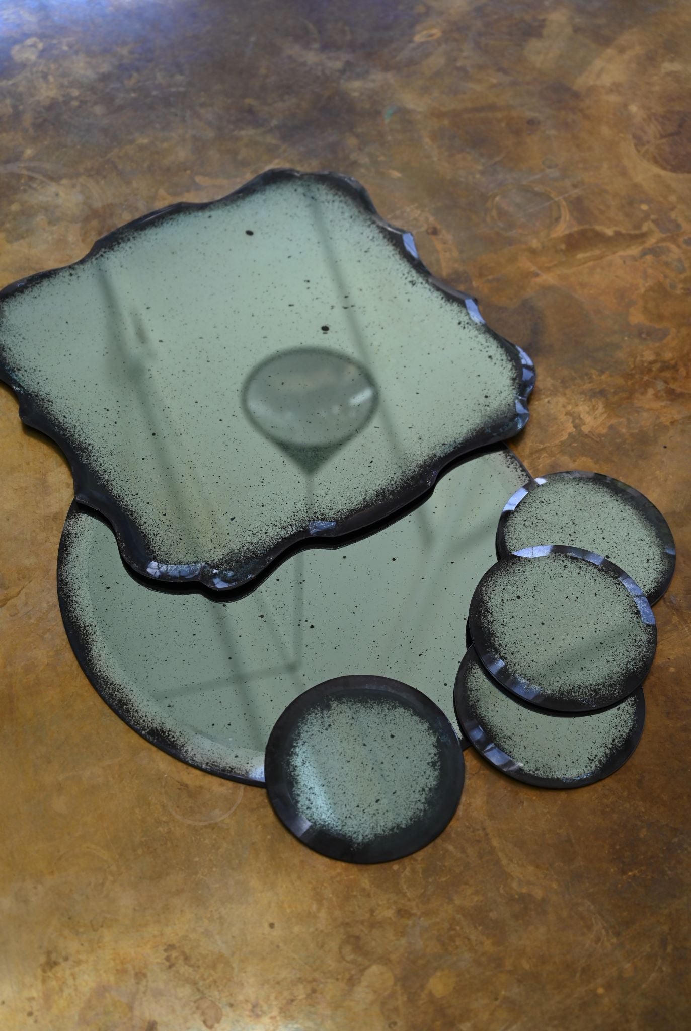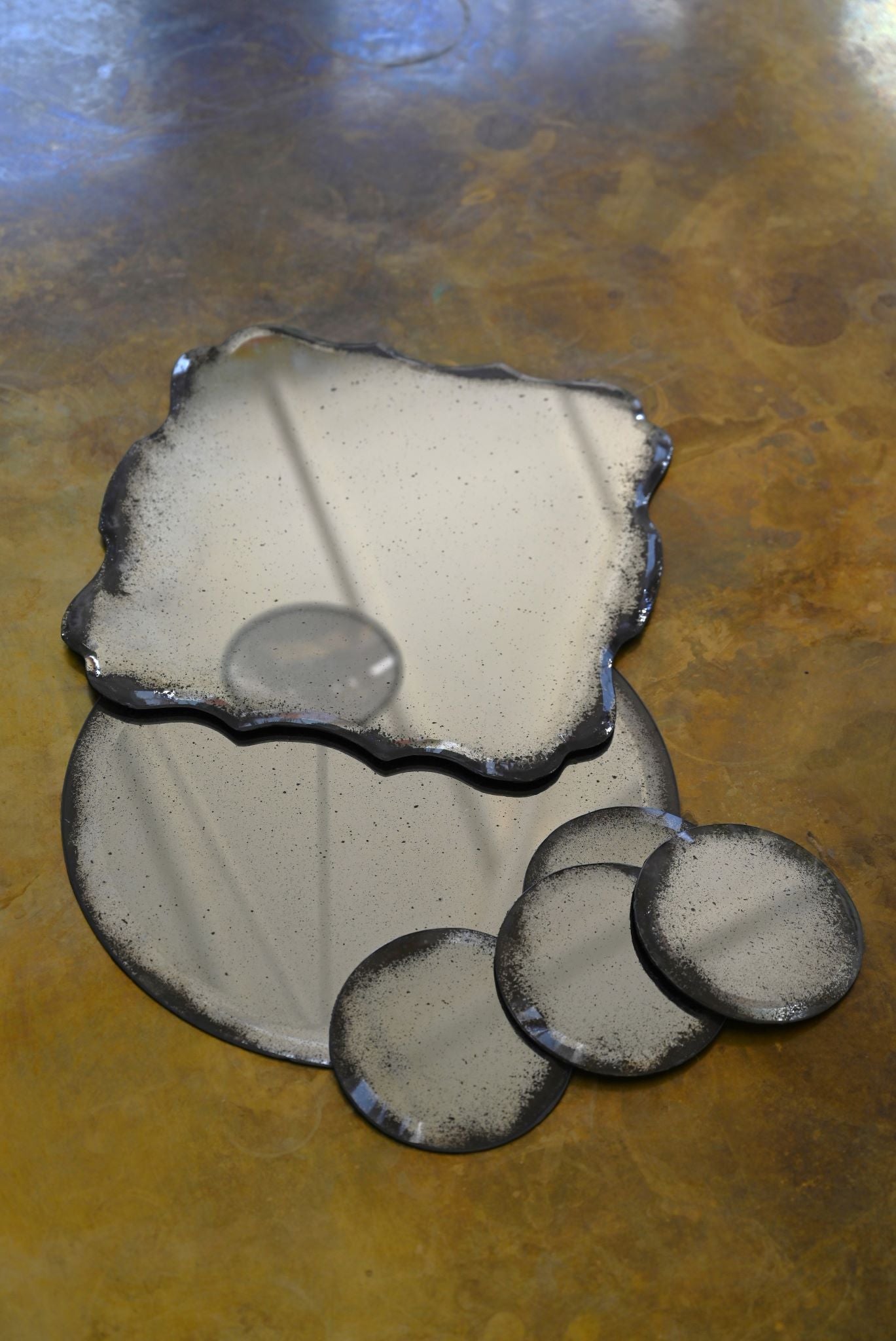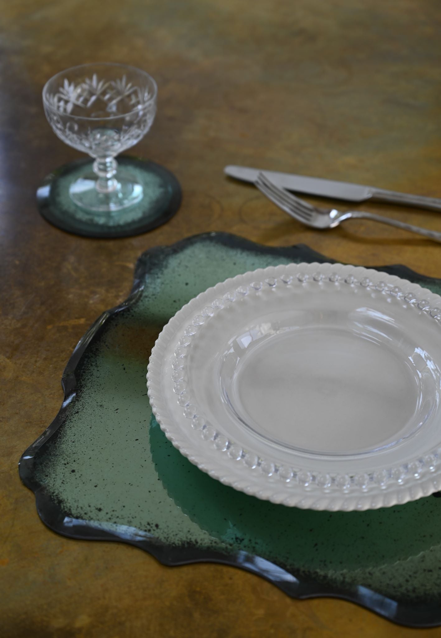 Reflect your home style with these ornate square placemats made of mirror with a hand bevelled scalloped edge. Each placemat has been gilded by hand by local maker Sean Phelan with a lustrous coloured finish and a distressed look border. If you've got handmade table you particularly love and want to show off, these mirrors are the perfect backdrop.