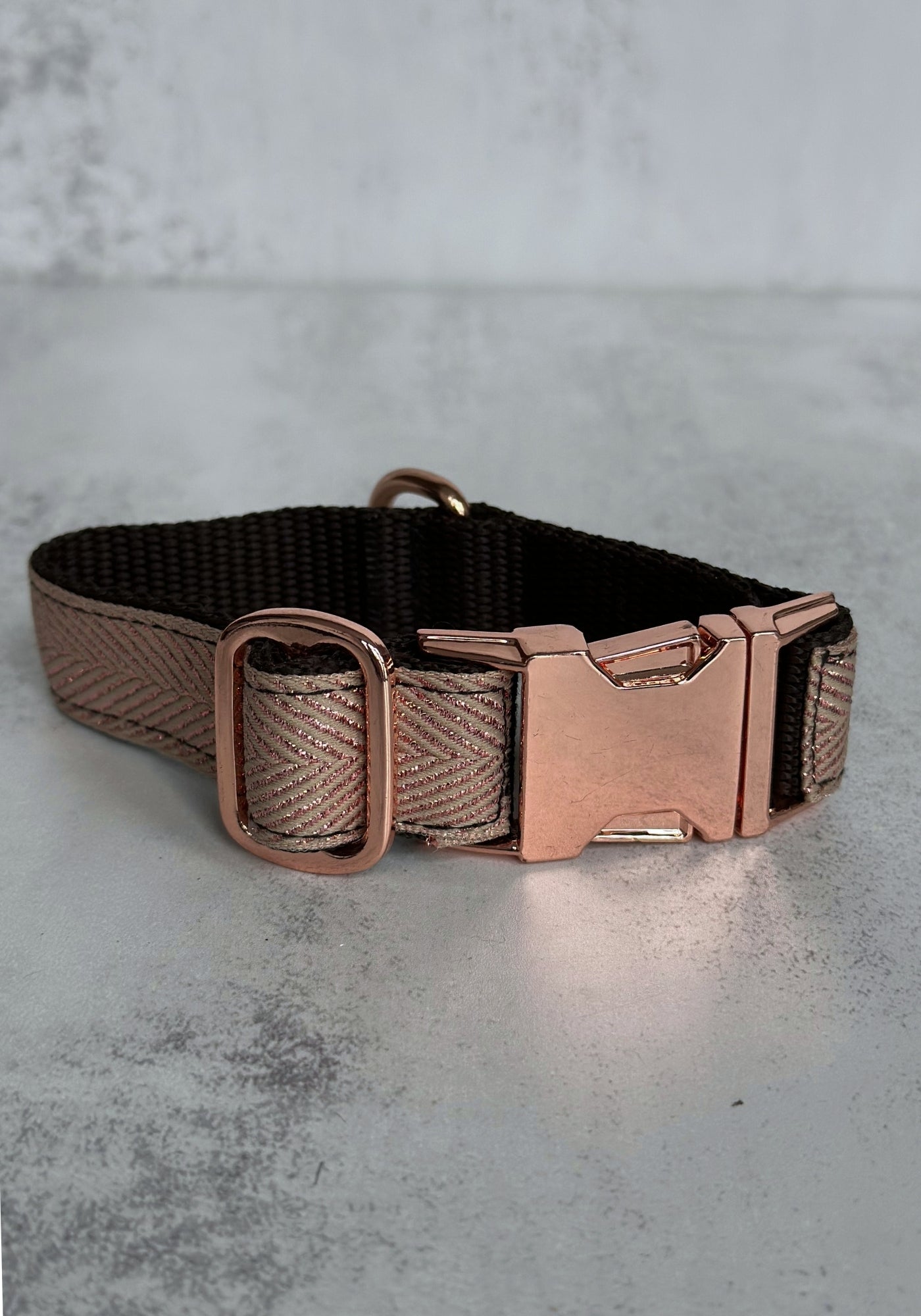 A small dog collar in a glittery rose gold colour that will certainly draw attention from admiring passers by and fellow stylish hounds. Designed in the UK by Pet Pooch Boutique, these shimmering pinky hued dog collars include matching rose gold hardware and an easy release buckle so that the look is completely cohesive.