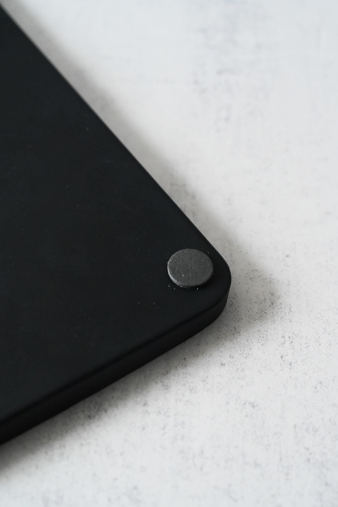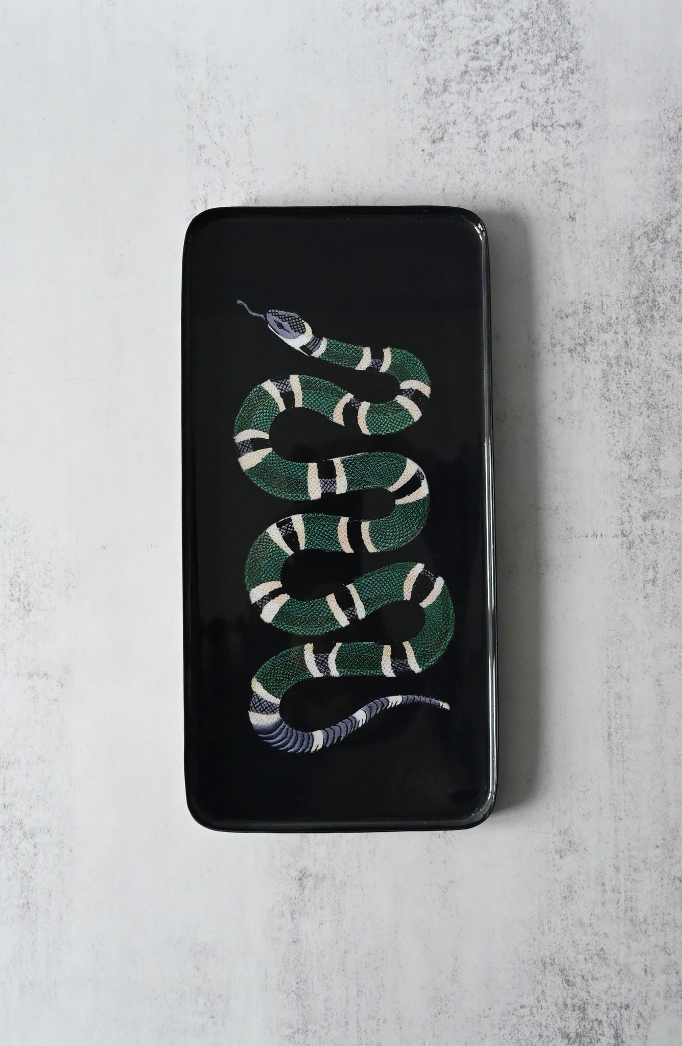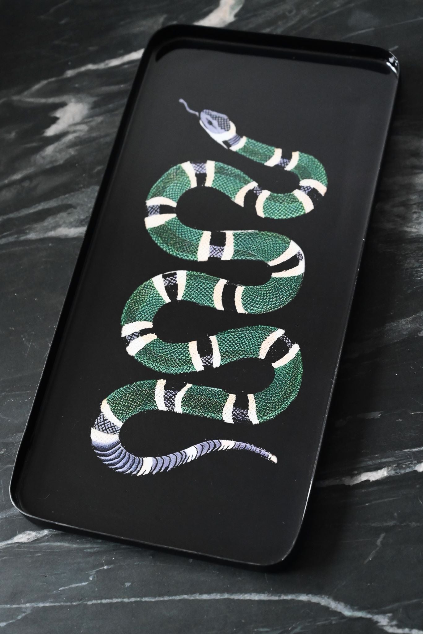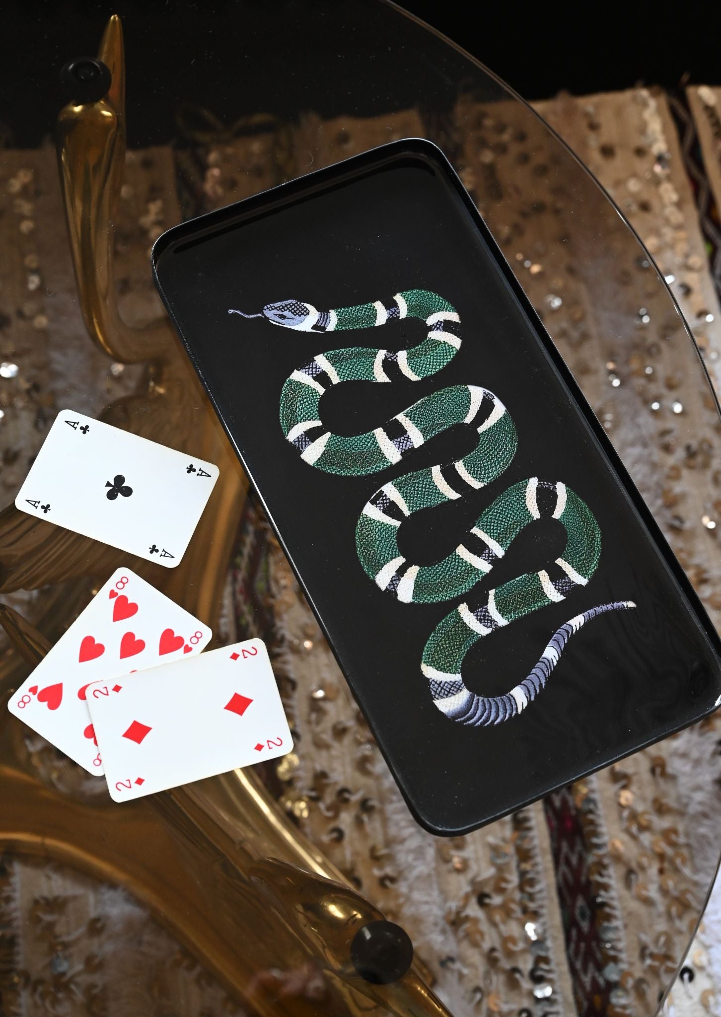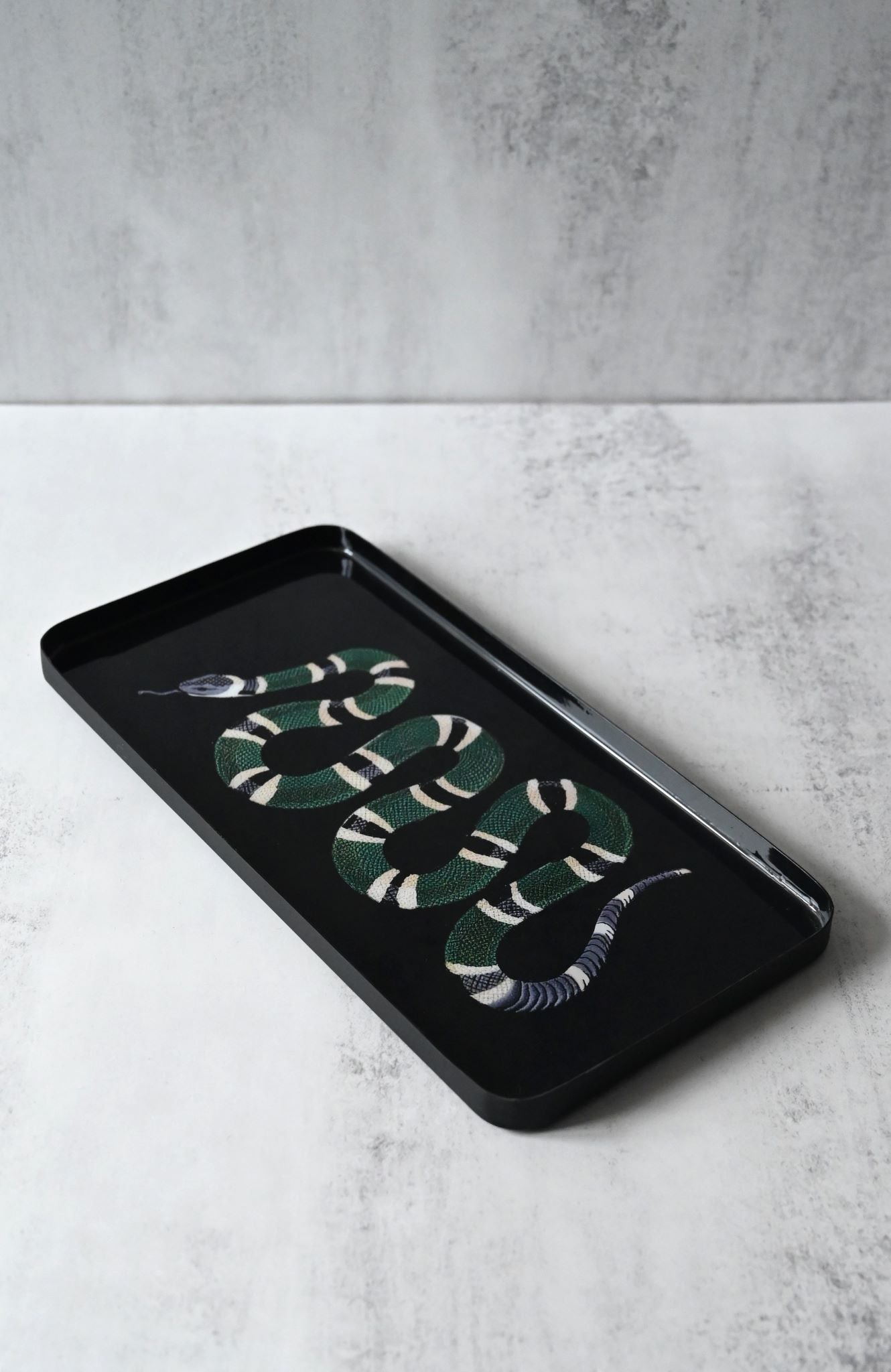 A modern gothic serving tray made from lightweight wood with an illustration of a green snake swirling in the centre of the shining black backdrop. It's the perfect size of tray for seductively serving two Rattlesnake cocktails to your date or as a piece of moody artwork in its own right at the centre of your coffee table.