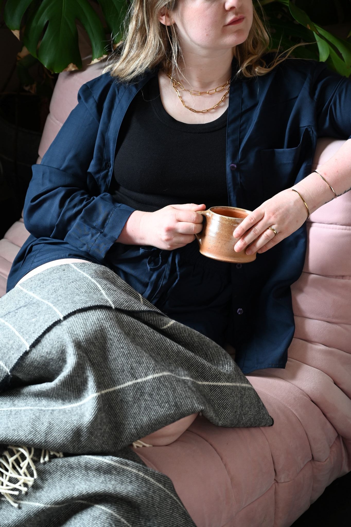 Inspired by vintage gentleman's suits worn in luxury airport lounges, the Lounge Suit in a moody midnight blue is a three piece loungewear suit that you can mix and match to create your perfect Sunday outfit whatever you get up to.