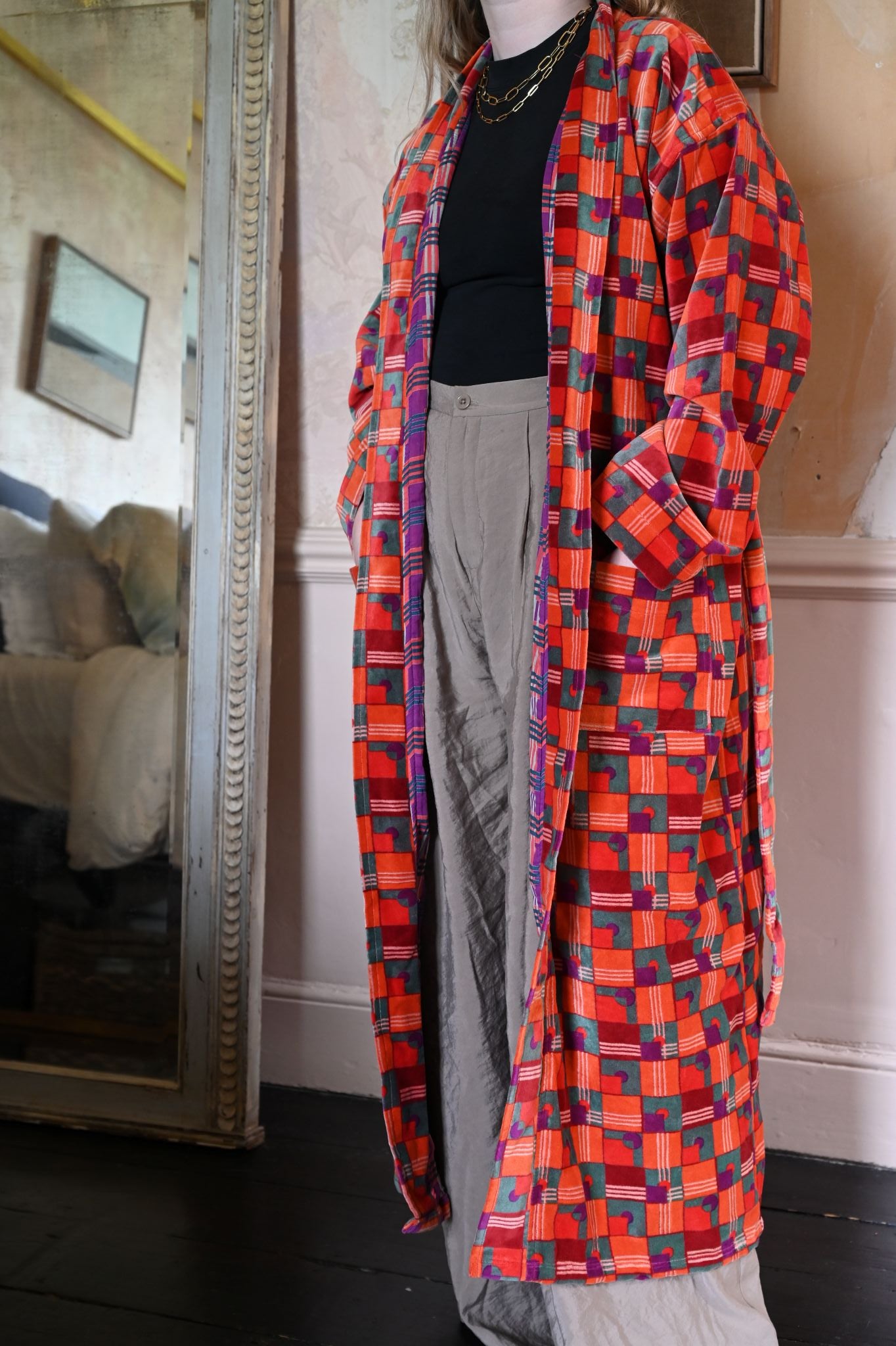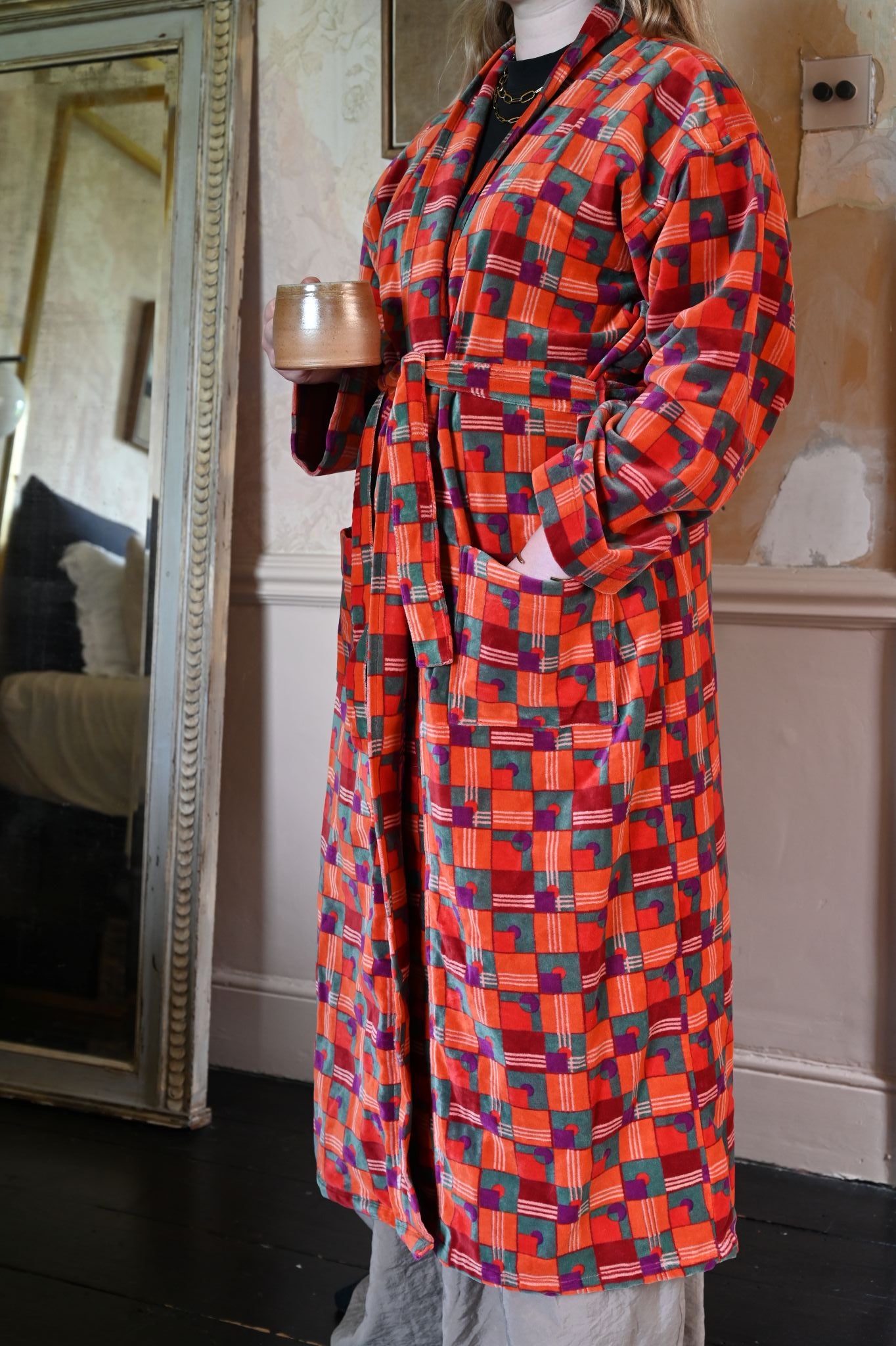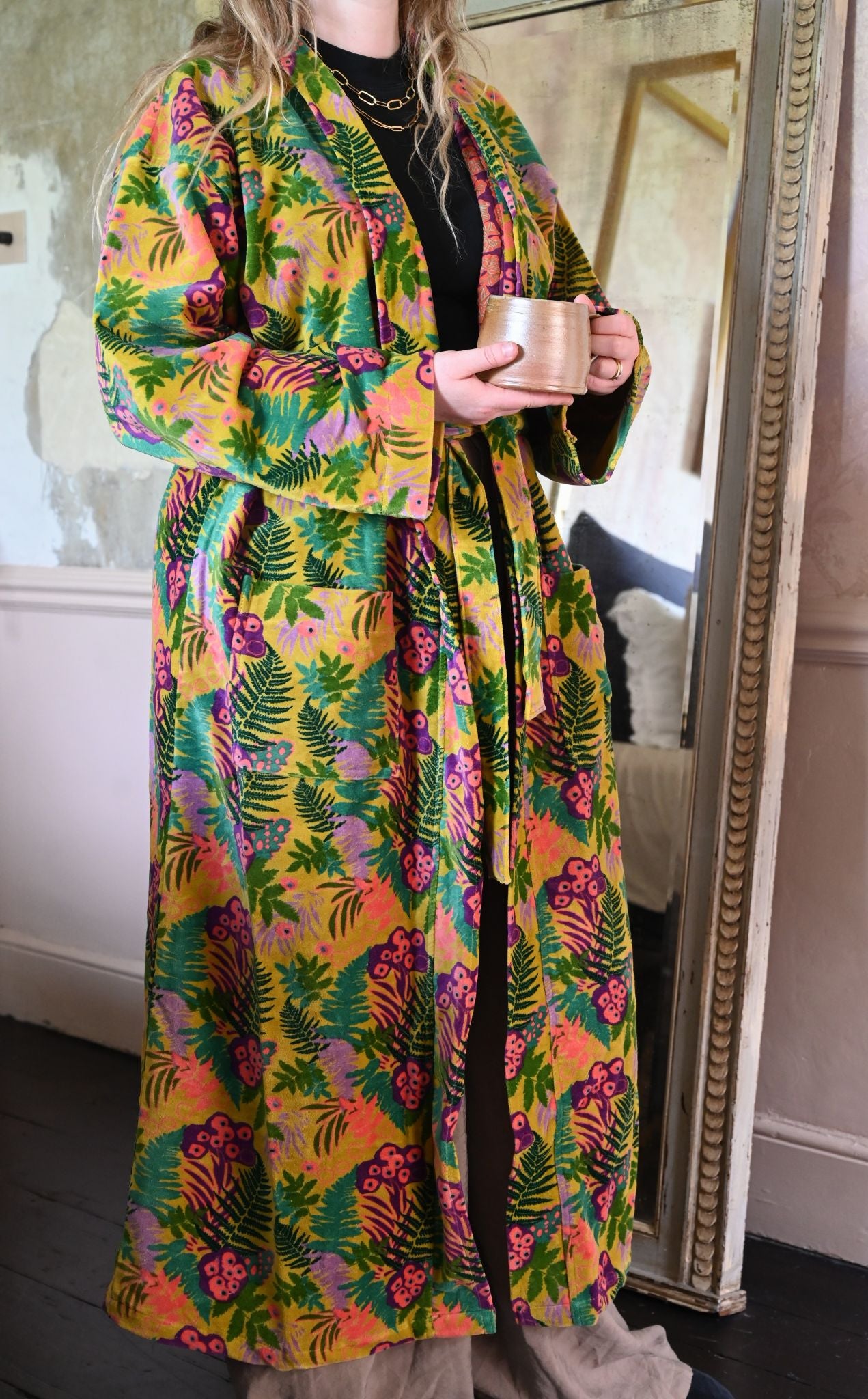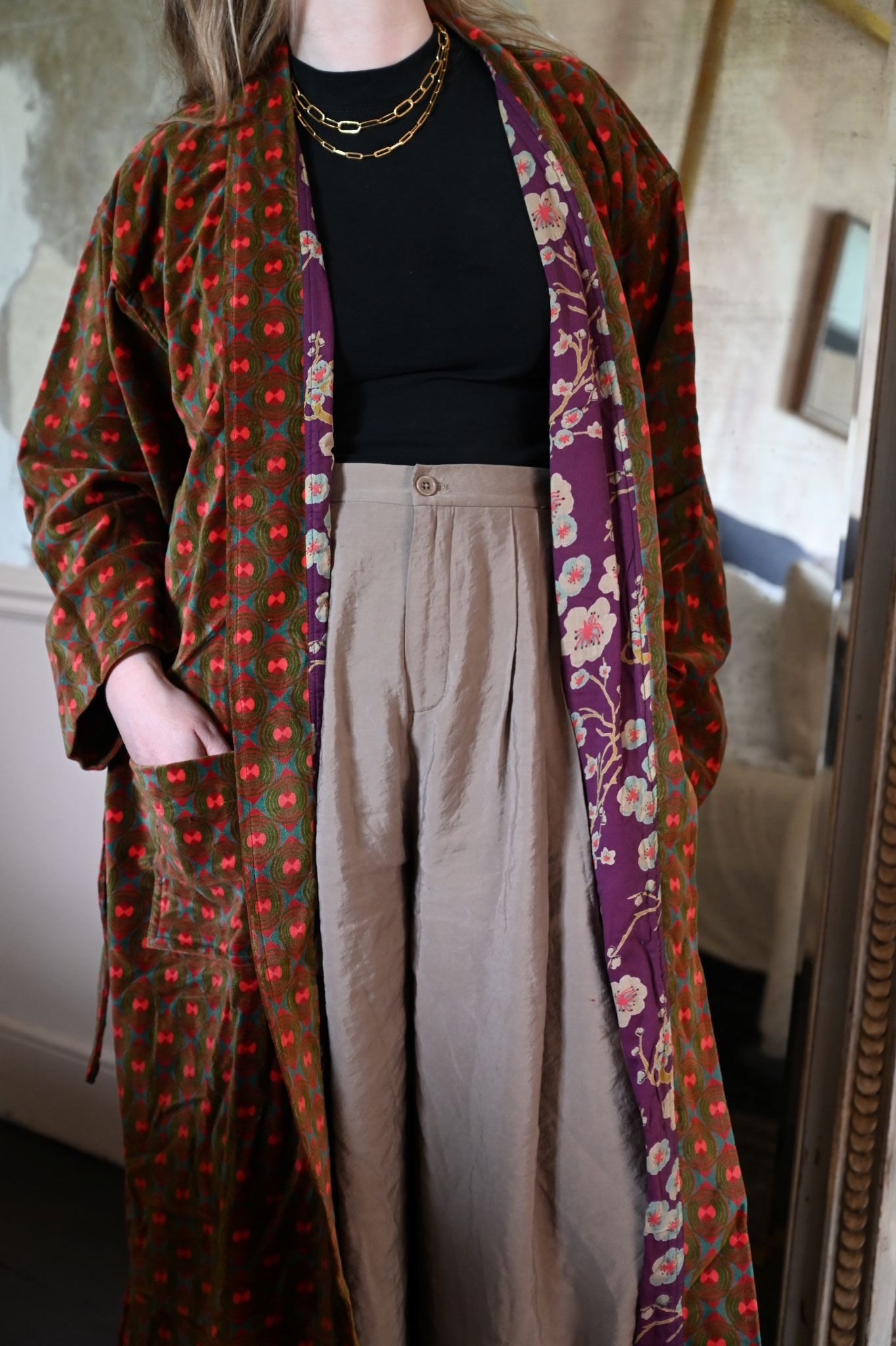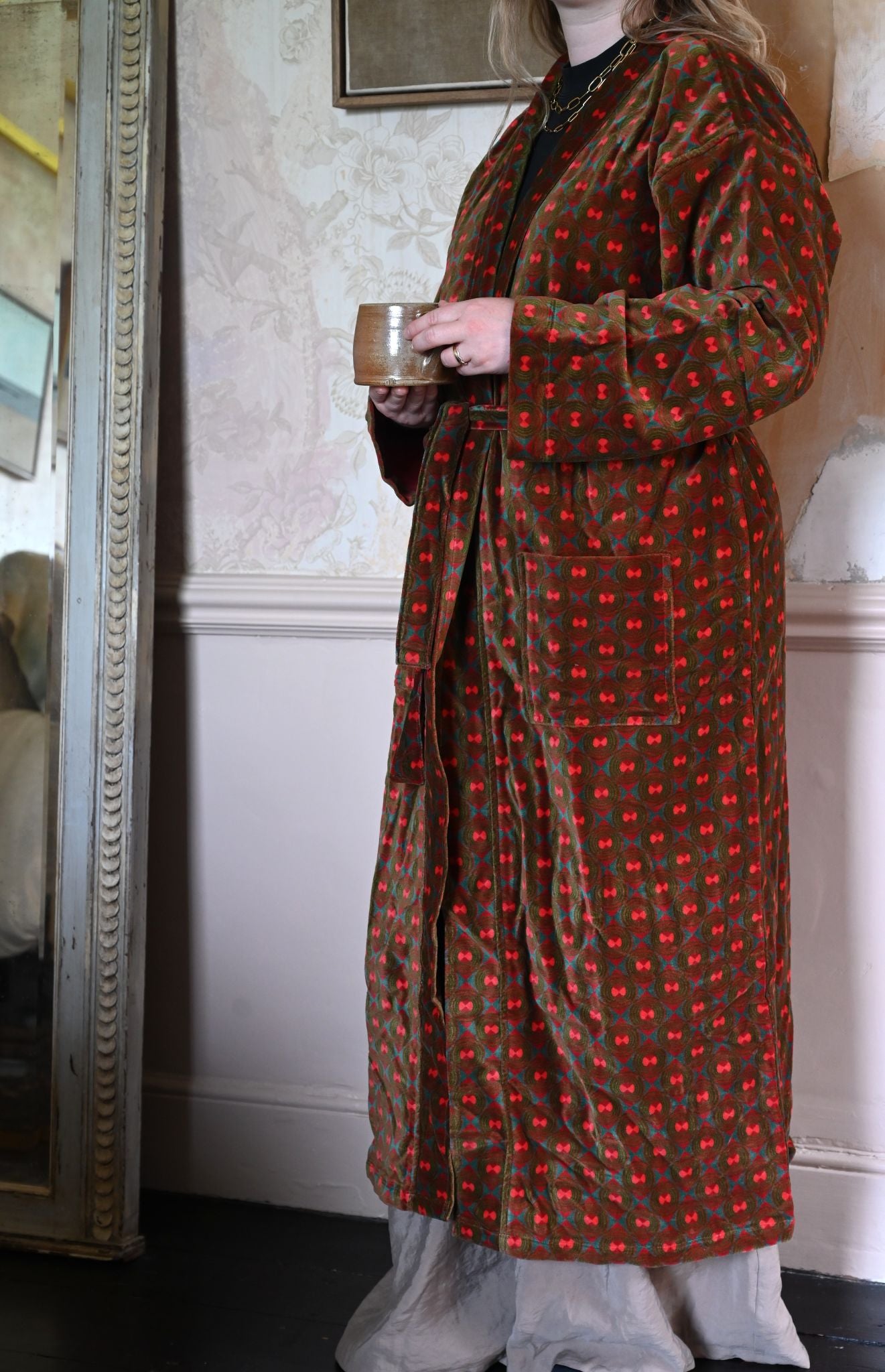 An elevated take on the velvet smoking jackets worn in gentleman clubs in the early 1900s, these velvet dressing gowns capture vintage travel-inspired prints and patterns and are designed by French textile house Les Touristes and made in Jaipur, world famous within the textile industry for its luxurious fabrics and designs.