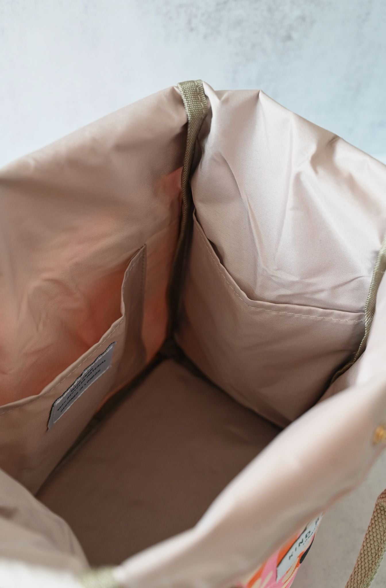 Includes 2 slip pockets inside (1 for cutlery and 1 for snacks), a magnetic roll top, sturdy handles and recycled button closures.
